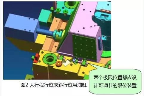 在模具結(jié)構(gòu)中油缸應(yīng)有行程限位控制開關(guān),確保活塞端隙;同時應(yīng)具備模具生產(chǎn)時自動控制所必須的信號源。